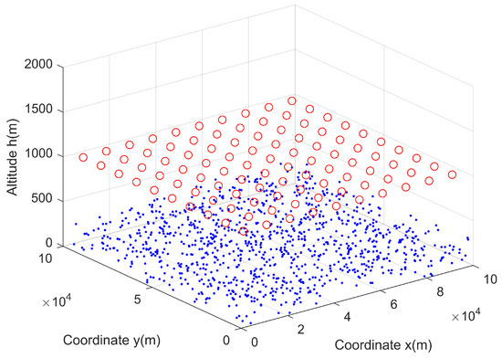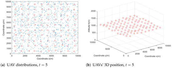 At the initial time, 100 UAVs are hovering at initial positions. The initial distributions of the UAVs and users are shown in Figure 3. The red circles represent the UAVs and the blue stars represent the users. In the horizontal direction, these 100 UAVs populate the desired area and each UAV has its responsible area, which is the small rectangle in Figure 3. The users are of random positions and numbers in each small rectangle. Meanwhile, each UAV has the same altitude . We also illustrate the user and UAV distributions in Figure 4, where we assume that the initial altitude of users ranges from 0 to 5 m.