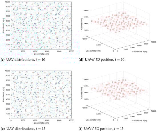 To illustrate the evolution of the mean field state under the control obtained by Algorithm 1 over a predefined period of time , we provide the distribution of the mass UAVs at different times, as shown in Figure 5. Here, T is set as 15 s. Figure 5 shows the changes in the distribution of the UAV at three times, namely, t = 5 s, 10 s, and 15 s. In Figure 5a–c, we show the 2D distribution of the UAVs (red circles) and users (blue stars) at those three moments. Meanwhile, we show the position changes of 100 UAVs in 3D space, which can be seen from Figure 5d–f. Compared with the initial time , the 100 UAVs find the optimal locations to ensure users’ access. The users’ access status is presented in Figure 6.