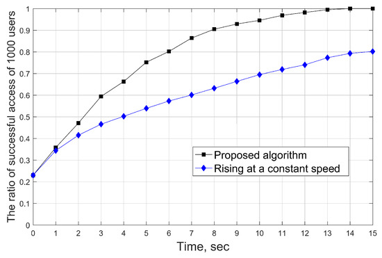 To verify the users’ access situation under these flight conditions, we show the access situation of all users in the predefined period of time in Figure 6. The black curve shows the rate of successful access of all users by adopting our proposed algorithm. At the initial time, the ratio of successful access of all users is at a lower level because the altitude of UAVs is lower and the initial position is certain, which corresponds to a smaller coverage area and the incorrect position. Then, all UAVs adjust their positions with the 3D optimal control. The ratio of successful access of all users rises until they all can access. Clearly, it is seen that this ratio reaches 1 at t = 14, which means that when the system reaches equilibrium, the user’s access target will be satisfied. For comparison, we assume that all UAVs increase access ratio in the same flight mode (rising at a constant speed), as shown in Figure 6. It can be observed that the ratio of user’s access is still at and the growth is slow until the last time t = 15. Clearly, there is an obvious gap between the proposed algorithm and the benchmark scheme for the ratio of successful access. This is because the solution derived from the HJB equation follows the Bellman principle of optimality, which selects the optimal actions for system control.