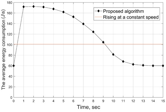 In Figure 8, we present the average flight energy consumption of 100 UAVs. At the initial time, all UAVs hover at the same altitude (1000 m), and the initial energy consumption (hover energy consumption) is 60 J/s. Then, each UAV flies by adopting the optimal control, which leads to a higher average flight energy consumption at the beginning for achieving the SINR requirements. Subsequently, the average energy consumption decreases because the closer target area implies that more users are capable of reaching the threshold of SINR. The equilibrium emerges when all users arrive at the SINR threshold. At that time, each UAV keeps hovering, and the flight energy is restored to 60 J/s. The red straight line represents the average energy consumption of 100 UAVs by rising at a constant speed. The energy consumption is a constant at each time. Combining with Figure 6, when the proposed algorithm arrives at equilibrium, the total energy consumption by all UAVs is close to the energy consumption of all UAVs rising at the same speed by using the same time, but the users’ access rate is higher.