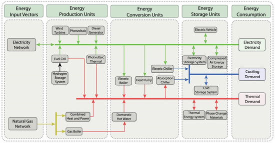 This section outlines the technological architectural framework adopted to realise a typical MES. These systems are often designed to integrate and manage multiple energy production systems, including electricity, gas, and interaction with the district heating networks. The input vectors are utilised to operate the DG systems and conversion units, which are capable of concurrently providing electrical power, heating, and cooling demand. Figure 1 shows a typical MES framework—the selection of architectural frameworks utilised depends on the input vectors’ availability and user demand. The green colour arrows represent the flow of electricity, blue for cooling, red for heating and yellow for natural gas flow. The core components include energy input vectors, production, conversion, and storage units. To balance the energy flow, an intelligent controller is utilised to monitor and manage the multiple energy flows within the system.