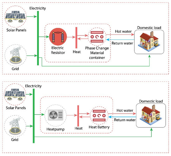 The most common energy storage technologies used in residential MESs are battery energy storage systems (BESSs) and thermal energy storage (TES). Electrochemical-based lithium-ion batteries dominate the market due to their high energy density and efficiency, but they face challenges related to resource limitations, recycling difficulties, and safety risks. The impact of ambient temperature and degradation affects BESS performance and efficiency over time, occurring due to the chemical reactions within the BESS model. TES is utilised to store cooling and heating excess energy for the short or long term. Gas storage systems are also deployed in several architectures in the MES to store natural gas or hydrogen gas, which is produced to utilise excess energy efficiently and convert it to another useful form for later usage. Installing multi-energy storage systems raises several problems that require an energy management strategy to simultaneously control and schedule energy sharing among components to achieve technical and economic objectives. In this context, Xu et al. [59] evaluated MESs with multi-energy storage for residential buildings to reduce carbon emissions, energy consumption, and initial cost and maximise self-consumption. MILP is used to optimally utilise the DRPs to store electrical energy from the grid. The results demonstrated that thermal energy storage devices are economically better options than electrical storage devices with shorter lifetimes and high investment costs. Similarly, Marczinkowski and Østergaard [60] compared the installation of BESSs and TES in two islands (more details on this project are given in Section 4.1.1). The aim was to maximise self-consumption on the islands. They varied the system size for both BESSs and TES. It was found that for BESSs, there are diminishing returns of adding more capacity, both economically and in terms of the self-consumption ratios. This was not the case for TES, which did not show such a trend. However, to utilise thermal energy, other equipment needed to be upgraded, which affected the system’s total cost. Overall, TES and sector coupling were more favourable solutions, as more energy vectors provide more flexibility. The study has limitations related to the peculiar nature of island energy systems. An analysis of national grids would be different. Ndwali et al. [61] discussed various strategies and control techniques for using thermal, ice, and electrical energy storage systems that simultaneously meet solar energy’s cooling, heating, and electrical energy demands. Violidakis et al. [62] compared two technologies of latent heat storage systems powered by PVs for providing heat and electricity. The first technology involved a low-temperature phase change material-based thermal energy storage system for residential heating needs, while the second technology included an ultra-high-temperature thermal energy storage system integrated into a building, as shown in Figure 2. The systems were compared with a traditional air-to-water HP heating system, and the study concluded that the ultra-high-temperature TES was more advantageous in terms of electricity supply. Inkeri et al. [63] utilised HPs and TES architecture for DHW production. DHW is produced using HPs operated at low energy pricing for electricity or solar energy. An updated NSGA was implemented by Schmid et al. [64] to optimise the size of MESs and reduce energy costs. PVs are used as a primary energy source, and electric heaters and air-to-water HP are used to meet heat demands. The authors conducted long-term and short-term analyses considering three locations with different energy prices. They found that low-energy hoses show an additional 172% reduction in cost projection compared to low-seasonality locations.