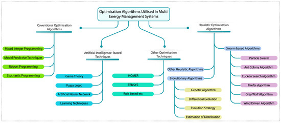 Enhancing efficiency and reducing the costs and emissions of MESs are key research objectives often addressed when introducing energy management strategies. Energy management strategies based on mathematical optimisation techniques are used extensively in the literature to achieve these objectives. In addition to these objectives, key focus areas include dispatch strategy, energy flow, demand forecasting, operation, grid stability, and energy balance. Optimisation strategies involve tackling these objectives based on single- and multi-objective problems. To assess economic performance, initial investment, net present value, levelised costs, operating costs, and net present value costs are some primary objectives [72]. Whilst multi-objective optimisation is applied to solve optimisation problems to provide a combination of solutions with trade-offs to keep balance among various objective functions, which can be minimisation or maximisation problems, to solve the multi-objective problem, several methods are adopted to divide the problem into a single-objective problem. These methods include lexicographic and weighting factor methods, whereas Pareto methods are deployed to generate a series of optimal solutions for a multi-objective problem. The optimised solution is then selected based on the criteria set for the optimised solution. Figure 3 illustrates and categorises the optimisation techniques evaluated in this study, which are used in finding optimal or near-optimal solutions to an energy management problem. This work categorises these techniques into four major groups: conventional techniques, AI-based techniques, heuristics algorithms, and other scheduling techniques.
