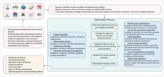 Heuristic algorithms are inspired by natural processes to efficiently explore the search space to obtain an optimal solution to a problem. However, finding a global optimal solution to a complex optimisation problem is not guaranteed, as most are stuck in the near-optimal solution. Figure 4 shows a flowchart of optimisation algorithms functioning for multi-energy management. Figure 4 provides a comprehensive overview of the optimisation algorithms’ frameworks, designed to achieve a complex energy management problem solution. The optimisation framework utilised to solve the problem incorporates various decision variables, objective functions, constraints, and key steps of the optimisation process, as depicted in Figure 4. The process begins with initialisation and input data, including building types or consumer data, load data, temperature, and emissions, as well as the technical data of the integrated energy resources or RES-based DG systems. These inputs and their constraints are utilised to design objective functions to minimise costs, emissions, and energy consumption and optimise planning, design, size, etc. These objective functions are some of the most widely used parameters to assess the optimisation algorithm’s reliability and capability in solving a complex energy management problem. Moreover, the constraints are primarily imposed on the operation strategies of the energy generation and storage units to achieve energy balance and operation schedule optimisation. Multiple optimisation algorithms are applied to explore the predefined search space and solve the optimisation problem. An iterative process is used to determine and refine the potential problem solution until an iterative process or desired optimal solution is achieved. As shown in Figure 4, each algorithm employs a specific strategy to achieve the desired optimal solution, mainly evaluating the objective function, position updating, exploration, exploitation, etc., to navigate towards the optimal solution in a predefined search space. By leveraging such optimisation techniques and algorithms, the designed framework can achieve an optimal or near-optimal solution, ensuring energy efficiency and balancing reduced costs and emissions by load and generation units’ operational schedule optimisation.