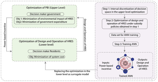 Coccia et al. [129] proposed an MPC-ANN-based management strategy to increase the self-consumption of RESs in grid-connected scenarios. With the use of MPC-ANN, up to 70% of energy consumption is reduced compared to the rule-based technique. In another work, Buffa et al. [130] presented an MES management strategy for large-scale residential users based on an MPC-ANN to reduce energy consumption in peak hours. Advanced controllers utilised DRPs from the grid to use low-price electricity for hot water tanks. The strategy rescheduled the operation time from peak hours to off-peak hours, resulting in a 3.5% reduction in utility bills. Figure 6 illustrates the functioning of the strategy utilised by Luo et al. [131] to solve energy management problems related to the design and operation of MESs with RES to increase computational efficiency and accuracy. The problem is modelled as a bi-multi-objective strategy where the government determines the optimal subsidy policies (upper level), and the residents optimise the HRES design and operation (lower level). ANN data are trained using the results from lower-level optimisation, which further enhances the accuracy while supporting decision-making and system design. The strategy utilised 57.01% of the solar energy of energy consumption in the standalone mode.