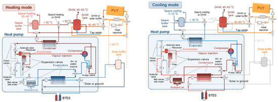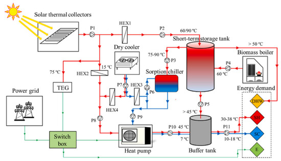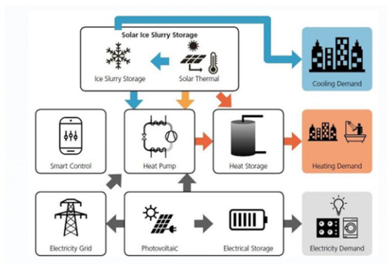 For instance, Trillat-Berdal et al. [67] presented a strategy to meet the heating and cooling demands by utilising solar energy captured through a thermal collector for water heating, where the excess thermal energy is then injected back into the ground through boreholes. This is claimed to be advantageous, as it helps to balance ground loads, increases the operating time of the solar collectors, and prevents overheating issues. However, the authors did not consider exporting or selling the excess heating energy to the neighbouring buildings, which could be profitable in terms of operating costs. Calise et al. [68] proposed a PV-, WT-, and HP-based strategy for fulfilling a building’s electrical, heating, and cooling demands to reduce operational costs. The architecture consists of building-integrated PV (BIPV) modules with HPs and WTs, whereas in the other case study, the authors utilised a building-integrated PV-based thermal system (BIPVTS) with WTs and HPs. It was shown that BIPV modules have a shorter payback time of 5 years compared with the BIPVTS case, which has more than 7 years. However, in the case of the BIPVTS, 73% of carbon emissions are reduced, whereas BIPV reduced 69%.
