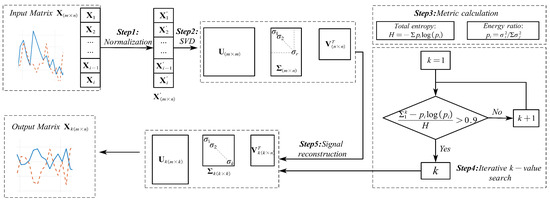 - Signal reconstruction: select the first k columns in the matrix to construct a matrix , the first k rows in the matrix to construct a matrix , and obtain the final denoised signal matrix .