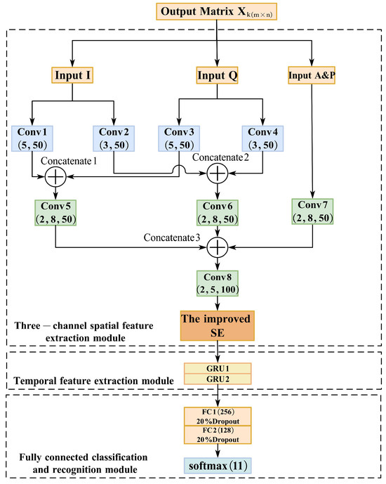 Third, an improved SE attention mechanism is integrated into the spatial feature extraction module to enhance key feature representation. Compared with the conventional SE module [37], GMP is added to jointly capture overall trends and abrupt features during channel weighting. This dual-pooling fusion enhances sensitivity to subtle variations in high-order modulation signals, improving their recognition and overall feature expressiveness. Furthermore, a GRU module is employed to model temporal dependencies, strengthening the extraction of modulation dynamics.