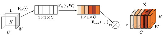The traditional SE block improves the feature expression capability of neural networks by modeling the relationship between channels, thereby improving the model performance [23], as shown in Figure 4. For the input feature map , H and W represent the height and width of a channel and C represents the number of channels. Its core consists of three modules: the Squeeze module , the Excitation module , and the Scale module .
