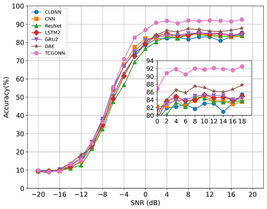 The recognition rate curves of CNN, GRU2, CLDNN, ResNet, DAE, LSTM2, and the proposed model TCGDNN for 11 types of signals at different SNR are shown in Figure 7.