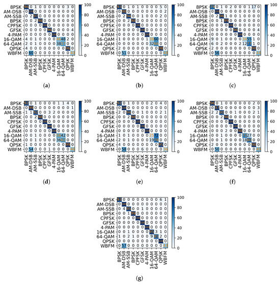 Confusion matrices for different models: (a) CNN. (b) LSTM2. (c) CLDNN1. (d) DAE. (e) ResNet. (f) GRU2. (g) TCGDNN.