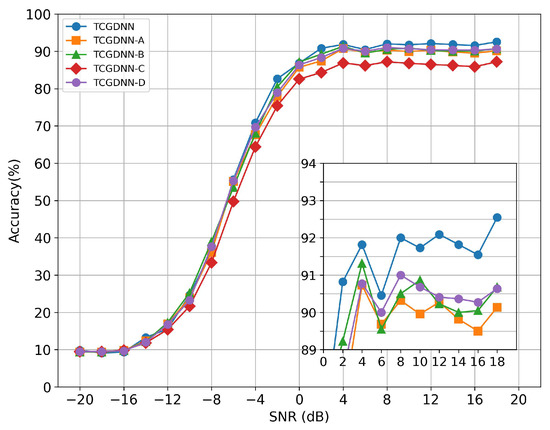 As can be seen from Figure 7, when the SNR is lower than −4 dB, the recognition accuracy of the comparison model and the proposed model is not good; as the SNR increases, the noise and random error of the input data decreases, the quality of the signal is higher, and the network is easier to learn and recognize accurately, thereby improving the recognition rate. When the SNR is higher than −4 dB, the recognition accuracy of the TCGDNN model proposed in this paper is significantly better than that of other comparison models, and the recognition curve is stable at around 92%.