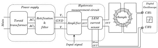 A block diagram of the proposed hysteresis measurement system is shown in Figure 1. The entire setup can be divided into two main parts: the power supply, which provides energy to the circuit, and the measurement system itself. The basic principle of operation is as follows: A sinusoidal voltage signal, with appropriate amplitude and frequency, is applied to the input of the amplifier via a signal generator. The amplifier then produces a test signal with the required characteristics, which is fed into the primary winding of the test sample. The induced voltage is measured on the secondary winding, while the current in the primary circuit is monitored using a LEM current sensor. A digital oscilloscope is used to acquire and process the measured signals. The following sections describe each subsystem in detail.