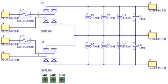 The secondary side of the transformer had a symmetrical winding ( and ), to which the two Graetz bridges [35] and the filter capacitors are connected, which, together, formed a symmetrical power supply (, , ). Fuses were also used between the secondary winding and the Graetz bridge. In the selection of the bridge rectifiers, safety was a key consideration, as was the ability to connect to the heat sink. The rectified signal was filtered with 3 × 4700 capacitors; further, to reduce high-frequency noise, we implemented a 100 nF ceramic capacitor in the circuit. The value of the capacitances was chosen based on a simulation (LTspice) and previous tests. The circuit was also equipped with an appropriately sized heat sink.