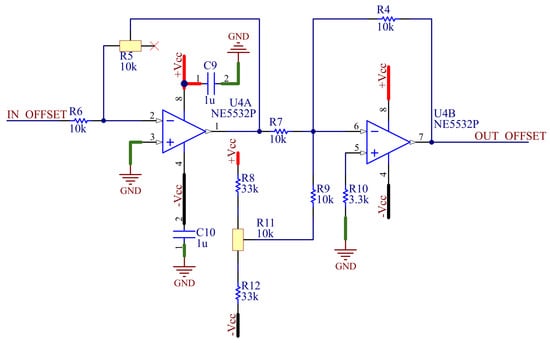 A schematic of the control and offset adjustment circuit is shown in Figure 4. The control section (U4A) is a negative-feedback operational amplifier configuration, used to fine-tune the gain range of the system. The second section (U4B) implements offset compensation. Both functions are realized using a dual-operational amplifier housed in a single package. The NE5532 was selected for this purpose due to its favorable supply voltage range and stable gain characteristics [36]. The NE5532 operational amplifier is well suited for use in audio-frequency applications thanks to its low noise, low distortion, and wide supply voltage range.