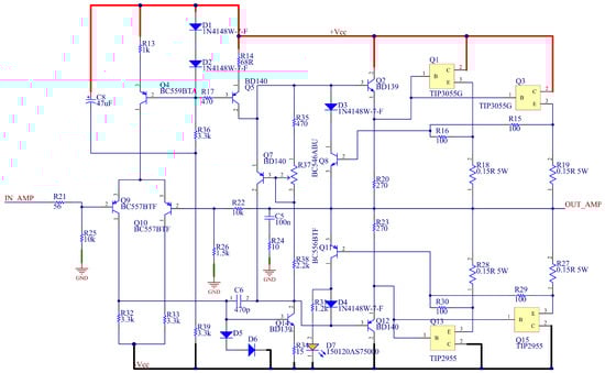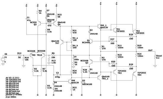 A simulation circuit diagram is shown in Figure 7. In the circuit simulation, the following simplifications were applied: the load was represented by a simple resistor, and the input signal was replaced by an ideal voltage generator (V3) at the input of the amplifier. The simulation of all components was based on the realistic SPICE models obtained from the manufacturers’ websites.