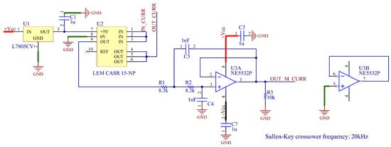 The choice of passive elements was based on the dissipation on them, which was determined by Ltspice-based simulation. For the encapsulation, the non-temperature-critical resistors were chosen to be 1206 in size to allow for hand soldering.The semiconductors were selected based on empirical and simulation data, taking into account the circuit on which this research is based. For example, the “classic 2N3055” TO3 package was abandoned and TO247 was chosen instead for heat sink mounting. Measuring the current is a critical point in the circuit. Based on previous experience and good technical characteristics, which include very good accuracy and linearity, low gain drift, a wide bandwidth, and a fast response time, the LEM family of sensors was chosen. Taking into account the value of the current to be measured, the LEM CASR15-NP type sensor was chosen for current measurement purposes. Its technical parameters are available in the datasheet of the device [37]. As shown in Figure 6, the current sensor operates with its own stabilized supply voltage, which is provided by an integrated voltage regulator of the type 7805. A low-pass Sallen-key-type filter with a cut-off frequency of 20 kHz was also designed for the output of the sensor. This is of course later modified by R1, R2, C3, and C4 if required. The operational amplifier of the low-pass filter does not require a separate stabilized power supply, since the supply voltage range of NE5532 is up to .