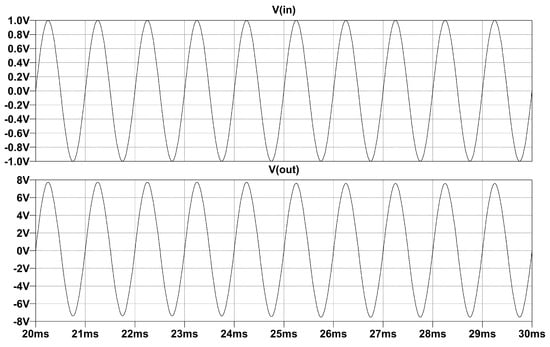 The first test is a basic simulation test to check the operation of the circuit. As can be seen in Figure 8, the output voltage of the amplifier follows Equation (2): an excitation signal of 1 V results in an output voltage of 7.54 V.