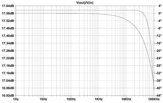 The frequency range was set to extra wide for the simulation (1 kHz–100 kHz). The simulation results are shown in Figure 9. The results clearly show that the output voltage gain is close to the calculated and simulated values (, given here in dB (17.36 dB)). The gain is stable within the desired range.