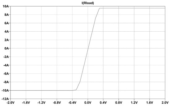 The third simulation demonstrates/validates the operation of electronic overcurrent protection. As shown before, the output current is limited at A. To demonstrate this, a DC simulation was run where the input excitation signal (V3) was varied between −2 V and 2 V and the load was chosen to be extremely low ( ) to achieve extreme load conditions. The simulation results in Figure 10 show that the protection circuit works properly, both in the positive and negative ranges: the output current is limited to ±10 A.
