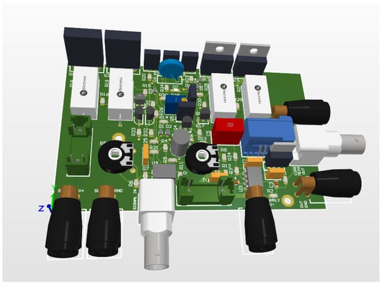 During the design process, the goal was to create a relatively inexpensive and modular system that can be used to automatically test and compare the characteristics of B-H curves in 3D-printed cores, which are manufactured by different technologies. The modularity of the system means that the power supply, the power amplification, and the measurement module are separated; therefore, each module of the proposed system can be developed further separately, or the proposed power amplifier can be used with other compatible labor devices, and the proposed experiments are reproducible. Also, taking into account manufacturability considerations, the PCB circuit was designed in two layers (top and bottom conductor layers) with special attention to the high-current parts. The circuit designs were created using Altium Designer software 26.5.2. The circuit layouts are not disclosed to save space. The 3D view of the designed printed circuit board (PCB) for the power amplifier circuit is shown in Figure 11. The proposed image was created in Altium Designer, and contains all of the used parts except the heat sink [38].