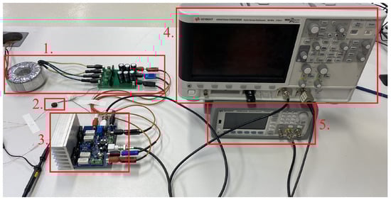 The manufactured PCB-based hysteresis measurement device with the necessary power supply, signal generator, and measurement device, which was an oscilloscope in our benchmark case, can be seen in Figure 12. The Keysight 33500B signal generator provided the sinusoidal control signal for the hysteresis measurement circuit, while the toroidal core-based power supply powered it. A Keysight DSOX2022A oscilloscope measured the signal of the LEM-type current sensor and the voltage of the sample secondary coil. To reduce measurement noise and increase the accuracy of the recorded measurements, a digital oscilloscope performed signal averaging over four complete memory recordings during the measurements.