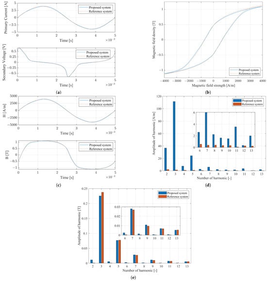 (a) The measured current and voltage using the proposed and reference measurement systems. (b) The measured hysteresis curve using the proposed and reference measurement systems. (c) The measured magnetic field strength and magnetic field density with the proposed and reference measurement systems. (d) The harmonic content of the measured magnetic field strength. (e) The harmonic content of the measured magnetic field density.