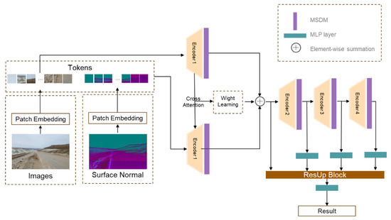 In the encoder stage, a Transformer-based architecture is employed to extract features from the input data. The Transformer architecture effectively captures both local and global contextual information through its multi-head self-attention and feed-forward neural network modules [28]. Specifically, the input data consists of RGB images and surface normal maps derived from LiDAR point clouds. To adapt these inputs to the Transformer architecture, we first apply patch embedding to both the RGB images and surface normal maps. This process segments the images and maps into smaller patches, which are then converted into tokenized sequences. These tokenized sequences are subsequently fed into a series of Transformer layers, each of which includes multi-head self-attention and feed-forward neural network modules, enabling deep feature extraction and transformation. We implement positional encoding using 3 × 3 convolution to enhance the model’s ability to capture global contextual information.