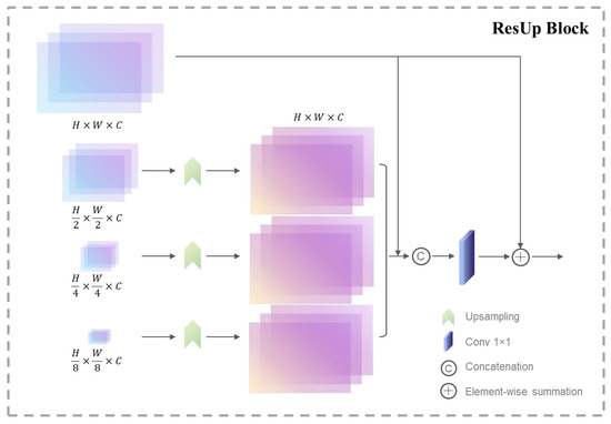 In the resup block, the upsampling module employs a bilinear interpolation strategy to upsample feature maps from different stages of the encoder to the same resolution as the highest-resolution feature map. Compared with transposed convolution, bilinear interpolation is more computationally efficient and can effectively retain contextual information through feature fusion mechanisms [30].
