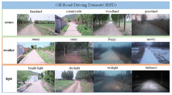 The experiments in this paper utilized the ORFD dataset. As illustrated in Figure 4, in terms of scene categories, the dataset encompasses diverse unstructured road scenes, including farmland, countryside, woodland, and grassland. Regarding weather conditions, it covers a variety of scenarios for autonomous vehicle navigation, such as sunny, rainy, foggy, and snowy days. In terms of illumination intensity, the dataset includes conditions ranging from bright light to daylight, twilight, and darkness. From the perspective of data modality, the dataset comprises both image and LiDAR point cloud data. The LiDAR is a 40-line mechanical rotating LiDAR that generates 3D images through 360° rotation with 40 internal laser diodes. It has a measurement range of up to 200 m at 20% reflectivity and can generate up to 720,000 data points per second. The ORFD dataset contains a total of 12,198 pairs of LiDAR point clouds and images. Annotations are provided from the image perspective, distinguishing between traversable and non-traversable areas. For the annotation of LiDAR data, a method similar to that of the KITTI dataset is employed, where LiDAR point clouds are projected onto an RGB image plane to obtain depth information.