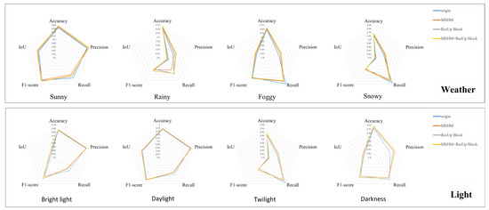 The performance of the proposed MRNet under different weather conditions (sunny, rainy, foggy, and snowy) and light intensities (strong light, daylight, twilight, and darkness) is shown in Table 3.