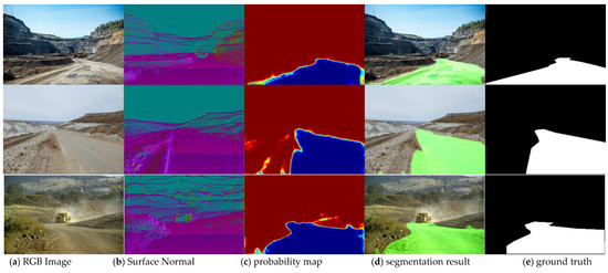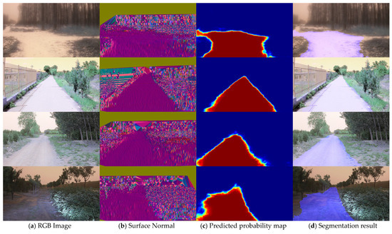 As mentioned in the quantitative analysis above, MRNet shows excellent performance in the task of identifying drivable areas on unstructured roads, and the module proposed in this paper improves the accuracy of the model. Figure 6 shows the visualization results of MRNet on the ORFD dataset. From left to right, the figure shows two input modes: RGB image and surface normal map, as well as the predicted probability map and the final road segmentation result superimposed on the original image. It can be intuitively observed that under various lighting and weather conditions, MRNet can accurately identify the drivable area of the road.