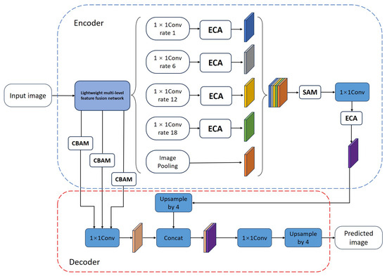 The structure of the lightweight semantic segmentation network with multi-level feature fusion and dual attention.
