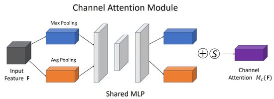 CBAM has the characteristics of taking into account both channel attention and spatial attention, which enables the model to be adaptively adjusted in feature representations of different scales and levels. Specifically, in the channel dimension, different channels in the feature map often represent different visual patterns and semantic information. However, the contributions of different channels are not balanced. Some channels contribute more to the final classification or segmentation task, while others may contain redundant or noisy information. To this end, CBAM uses global pooling (including average pooling and maximum pooling) to extract global information between channels and learns the importance distribution of different channels through a fully connected network to obtain the channel attention weight, as shown in Figure 4. The formula is shown in (5).