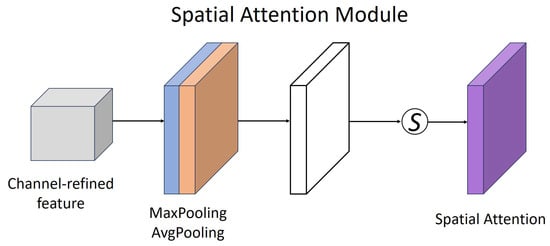 In the spatial dimension, since different areas of the image contribute differently to the semantic segmentation task, traditional convolution operations cannot accurately focus on key areas, which easily leads to the interference of irrelevant background information with respect to the target features. CBAM further introduces the spatial attention mechanism after channel attention. It also calculates the global response in the spatial dimension based on average pooling and maximum pooling and learns spatial weights through convolution operations so that the network can focus on the salient features of the target area while suppressing background noise. In this way, shallow features can focus more on local key structures, while deep features can also focus more accurately on the target area at a high semantic level, thereby avoiding information redundancy and noise interference that may be introduced by direct splicing. The spatial dimension processing is shown in Figure 5.