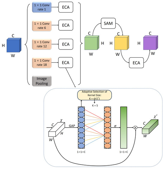 To make up for this shortcoming, we introduce the ECA (efficient channel attention) attention mechanism after the dilated convolution so that the network can adaptively adjust the weights according to the importance of different channel features. ECA uses local one-dimensional convolution to model cross-channel dependencies without introducing a fully connected layer, which not only reduces the computational cost but also avoids the information loss caused by channel compression. Specifically, ECA can capture the complementarity between channels and guide the network to prioritize the discriminative channel responses when integrating multi-scale dilated features, thereby effectively alleviating the feature sparsity problem caused by dilated convolution. In this way, ECA not only improves the expression integrity of deep features but also enhances the model’s ability to adapt to situations such as blurred boundaries and changes in target size in complex scenarios. Its structure is shown in Figure 6.