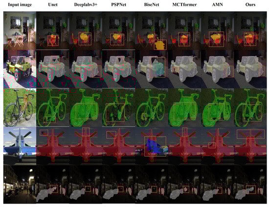 The proposed model is compared with semantic segmentation models such as PSPNet, Unet, Deeplabv3+, DCN-Deeplabv3+ [40], MCTformer [41], AMN [42], and BiseNet on the PASCAL VOC 2012 dataset. The specific experimental comparison results are shown in Table 1.