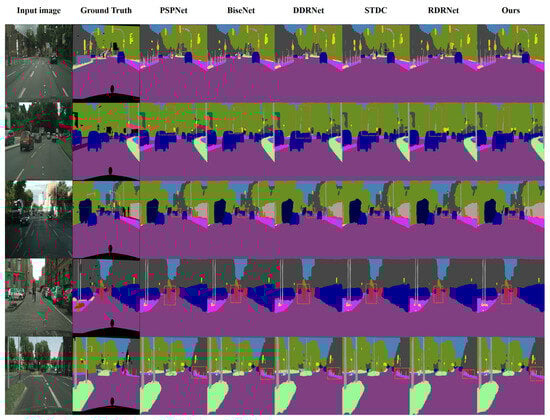 To further verify the generalization and effectiveness of the model, we conducted comparative experiments with PSPNet, EncNet [43], DDRNet [44], STDC [45], RDRNet [46], and other models on the Cityscapes dataset. The experimental results are shown in Table 3.