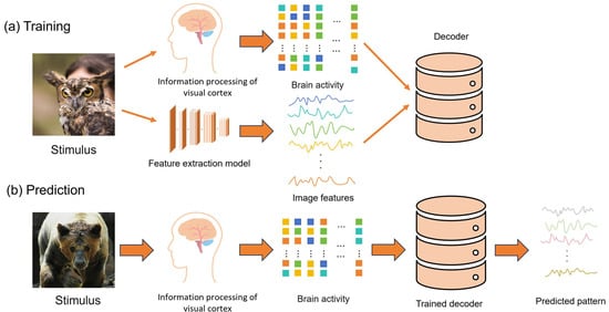 In this paper, we employ a linearized decoding method to construct a visual information decoding model based on state space. The visual information decoding model consists of two primary processes: training and prediction. The specific methodologies are summarized as follows, with Figure 1 illustrating the entire decoding process. The training process is depicted in Figure 1a. Initially, the image stimuli pass through the brain’s visual cortex and the visual feature extraction model, generating brain activity voxels and image features. Subsequently, these two sets of features are matched one by one to train the linear decoder. The prediction process is illustrated in Figure 1b. First, the image stimuli traverse the visual cortex to produce active voxels, which are then input into the trained decoder to predict image features. The correlation between the decoding model and various visual regions is established by comparing the predicted image features with the actual features. The following chapters will provide a detailed introduction to each step.