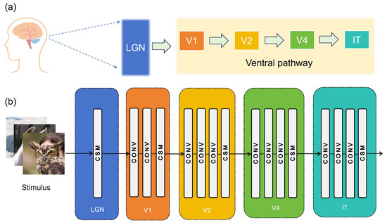 Vision is the most crucial means by which humans comprehend the external world [6,7]. Through the visual system, individuals can better interpret and interact with their surroundings. Numerous studies in the field of neuroscience have indicated that the processing of visual information in primates exhibits hierarchical characteristics [8,9]. The human visual system primarily consists of structures such as the eyes, optic nerve, lateral geniculate body, and the visual cortex of the brain. Visual information is projected onto the retina via the eyes, and the visual information received by the retina first passes through the LGN before being relayed to the visual cortex. The ventral pathway within the visual cortex plays a vital role in object recognition and semantic understanding [10], and its collaboration with other neural pathways forms a comprehensive mechanism for processing visual information in the brain [11]. Furthermore, existing research has investigated the mechanisms of visual information processing in the brain by developing relevant computational models. However, current decoding models have not completely captured the hierarchical representation of visual regions, nor have they fully elucidated the interactions between LGN and the ventral pathways.