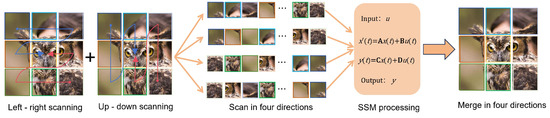 The Cross Scan Module processing flow. Firstly, flatten the input image according to four distinct scanning paths. Next, the flattened sequence of images is processed through the SSM. Finally, the outputs are merged to produce the final result.