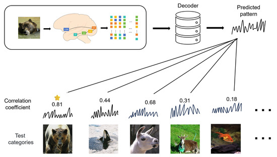 The image recognition process. The decoding model predicts the features of the image, and the correlation coefficient is calculated by comparing the true features of the image with the predicted features. The category with the highest correlation coefficient is then selected as the predicted category (Marked by a yellow star).