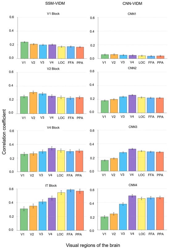 To comprehensively compare the decoding performance of SSM-VIDM and CNN-VIDM, we extracted image features from various levels of these two decoding models for analysis. The specific levels of the extraction modules are detailed in the third part of this study. For the sake of clarity in subsequent analyses, we designated the image features extracted by SSM-VIDM as V1, V2, V4, and IT blocks, corresponding to different levels. In contrast, the image features extracted by CNN-VIDM are labeled as CNN1, CNN2, CNN3, and CNN4. Given that each region of interest (ROI) in the visual area of the brain comprises multiple voxels, we selected 1000 voxels from each ROI for experimental analysis. We specifically focused on visual brain regions, including V1, V2, V3, V4, LOC, FFA, and PPA, for in-depth examination.