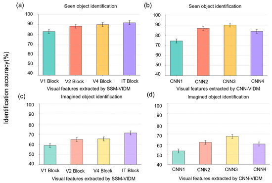 Image recognition accuracy of SSM-VIDM and CNN-VIDM. (a) The recognition accuracy of the SSM-VIDM for visible objects. (b) The recognition accuracy of the SSM-VIDM for imaginary objects. (c) The recognition accuracy of the CNN-VIDM for visible objects. (d) The recognition accuracy of the CNN-VIDM for imaginary objects.
