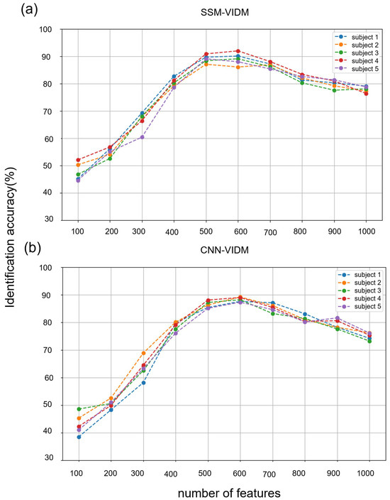 The image recognition accuracy of SSM-VIDM and CNN-VIDM with varying feature quantities is presented. (a) The recognition accuracy of SSM-VIDM with varying feature quantities. (b) The recognition accuracy of CNN-VIDM with varying feature quantities. The five colors represent the recognition accuracy for five subjects across different feature counts.
