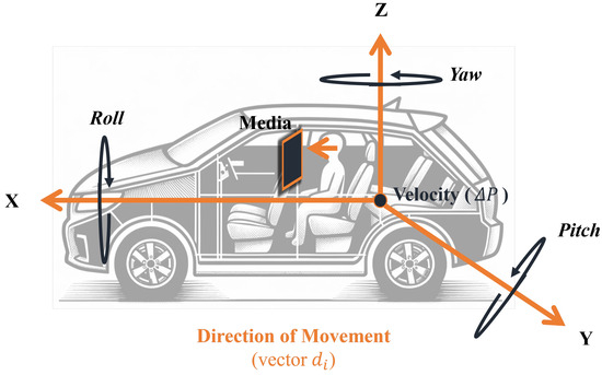 Within this environment, similar to real-world contexts, changes in the external surroundings, user motion, and display dynamics interact in complex ways (Figure 2). To build such a simulation, we modeled not only the vehicle’s exterior and interior but also the media environment. Among various parameters that can be used to adapt motion sickness reduction techniques to vehicle movement, angular velocity and acceleration are particularly relevant, as they strongly stimulate the vestibular system. Therefore, this study primarily focuses on reducing the vection illusion by targeting fluctuations in angular velocity and acceleration.
