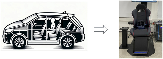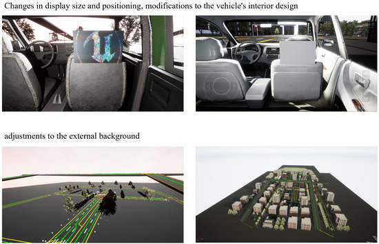 Based on insights from the pilot test conducted prior to the main experiment, several adjustments were made to enhance the experimental setup. These changes included extending the experiment duration from 5 to 10 min, modifying video content to induce stronger motion sickness, and providing written instructions to assist participants with questionnaire completion. Additionally, improvements were made to enhance immersion by enhancing the exterior background visible through the vehicle’s windows and improving the interior design of the vehicle. Figure 10 shows the content environment during the pilot experiment (left) and the enhanced environment for the main experiment (right).