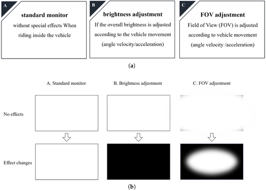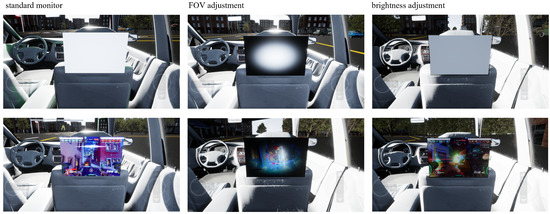 The first condition involved standard media playback without any special effects, simulating a basic in-vehicle viewing scenario with a standard monitor. In the second condition, brightness adjustments were applied to the in-vehicle display, dynamically adjusting according to the vehicle’s angular movements. The third condition employed field of view (FOV) adjustments on the display, where the FOV was modified based on the vehicle’s angular movements.
