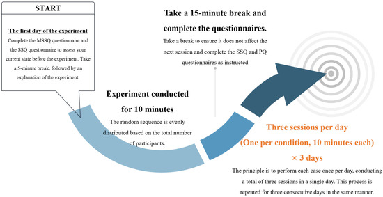 To minimize any sequence effects on the results, the order of cases was randomized. Each participant completed all three experimental cases in a single day, with this process repeated over three consecutive days. The procedure was as follows. On the first day, participants completed the Motion Sickness Susceptibility Questionnaire (MSSQ) and received detailed instructions about the experiment. Each case was conducted for 10 min, followed by a 15 min rest period that included time for participants to complete questionnaires, thereby minimizing carryover effects between cases. Motion sickness and immersion levels were measured using the Simulator Sickness Questionnaire (SSQ) and the Presence Questionnaire (PQ), administered after each case. An overview of this experimental procedure is illustrated in Figure 5.