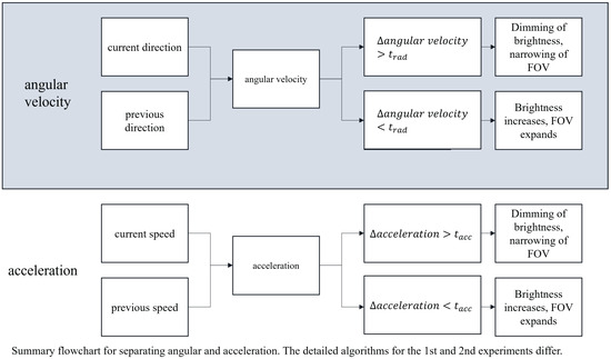 This study includes three experiments: a pilot experiment focused solely on angular velocity, the main experiment, and a secondary experiment, considering both angular velocity and acceleration. The primary emphasis is placed on significant changes in angular velocity, with minimal changes in acceleration considered secondary. Figure 6 depicts the overarching algorithm where these adjustments are implemented, summarizing the conditional logic used to trigger brightness and FOV changes based on angular and linear motion. When rapid visual adjustments are applied based on angular changes per unit time due to vehicle movements, they can potentially induce dizziness. To address this, we developed a method that adjusts FOV and brightness according to the duration of visual changes. Two distinct calculation methods were used for both angular velocity and acceleration.